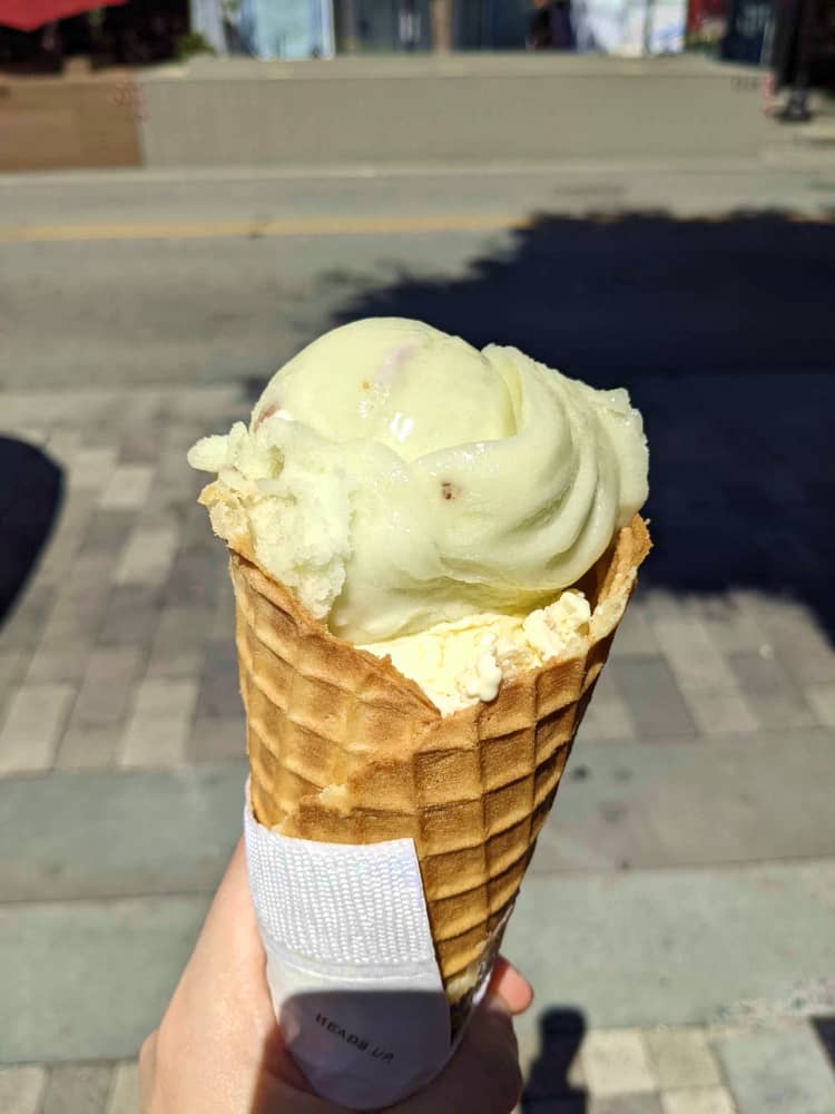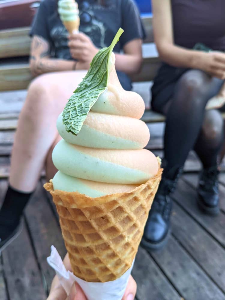 They have both regular ice cream and soft serve, but notably their soft serve flavors change regularly. You'll always get a trio of unusual flavor swirls - when I was there, it was Vanilla & Tangerine, Strawberry & Lemon, and Cantaloupe & Mojito. Not super unusual, but definitely uncommon I think! And this place has waffle cones too, of course. I do prefer Salt & Straw's which has a chewiness I like very much, but both are excellent.