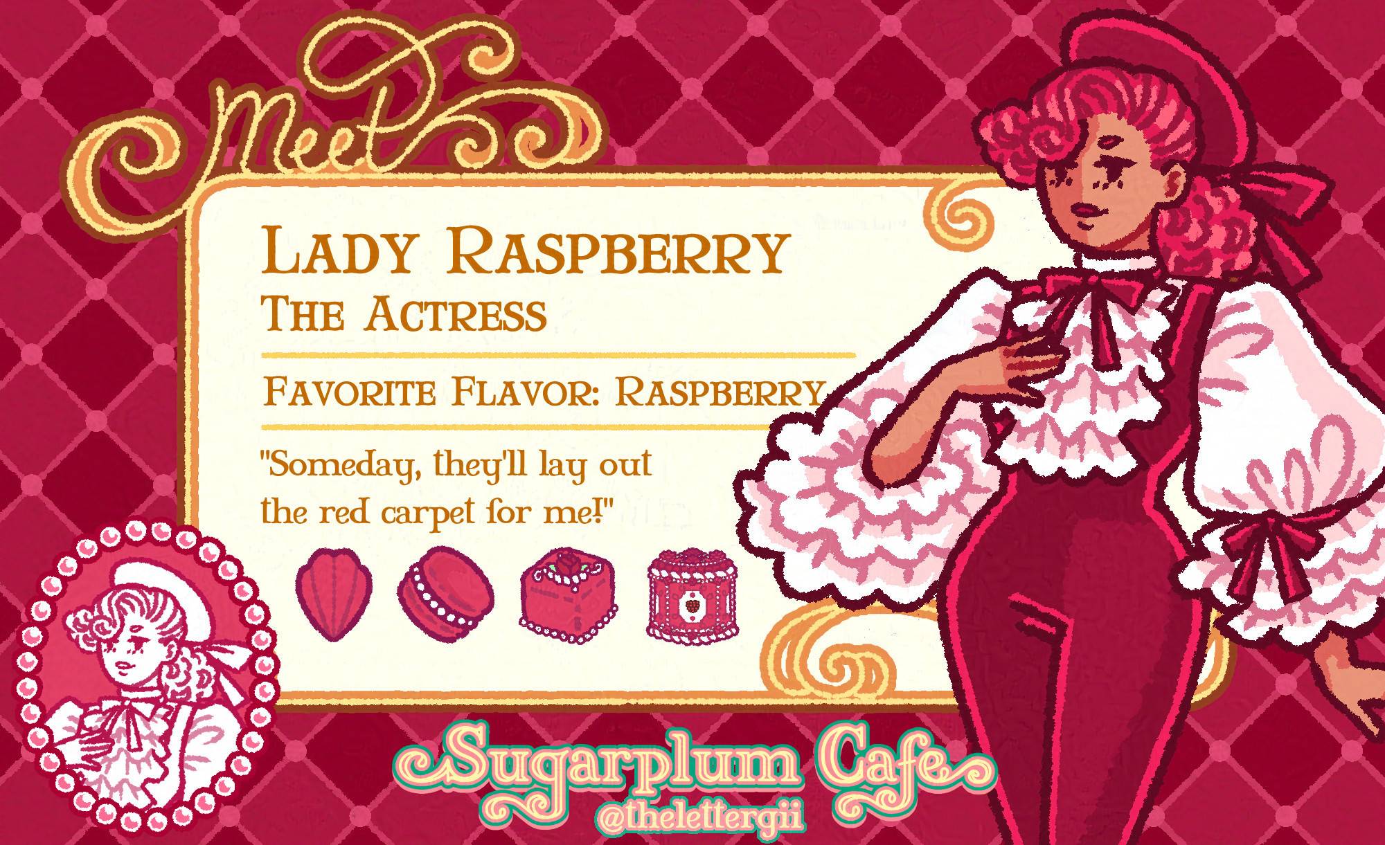 A character intro graphic featuring a lady in a dark magenta velvet bodysuit and beret, and white blouse with poofy, frilly sleeves. The text on the graphic says the following: Lady Raspberry, The Actress. Favorite Flavor: Raspberry. Quote: βSomeday, they'll lay out the red carpet for me!β