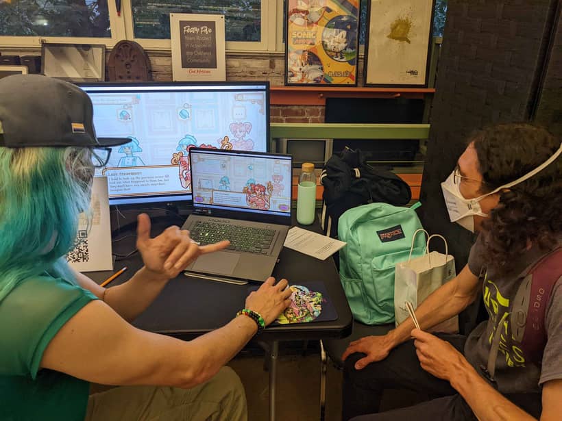 Two new friends playtesting at MADE. I definitely did not ask them to pose for me after their actual playthrough because I almost forgot to get photos. Why would I do that