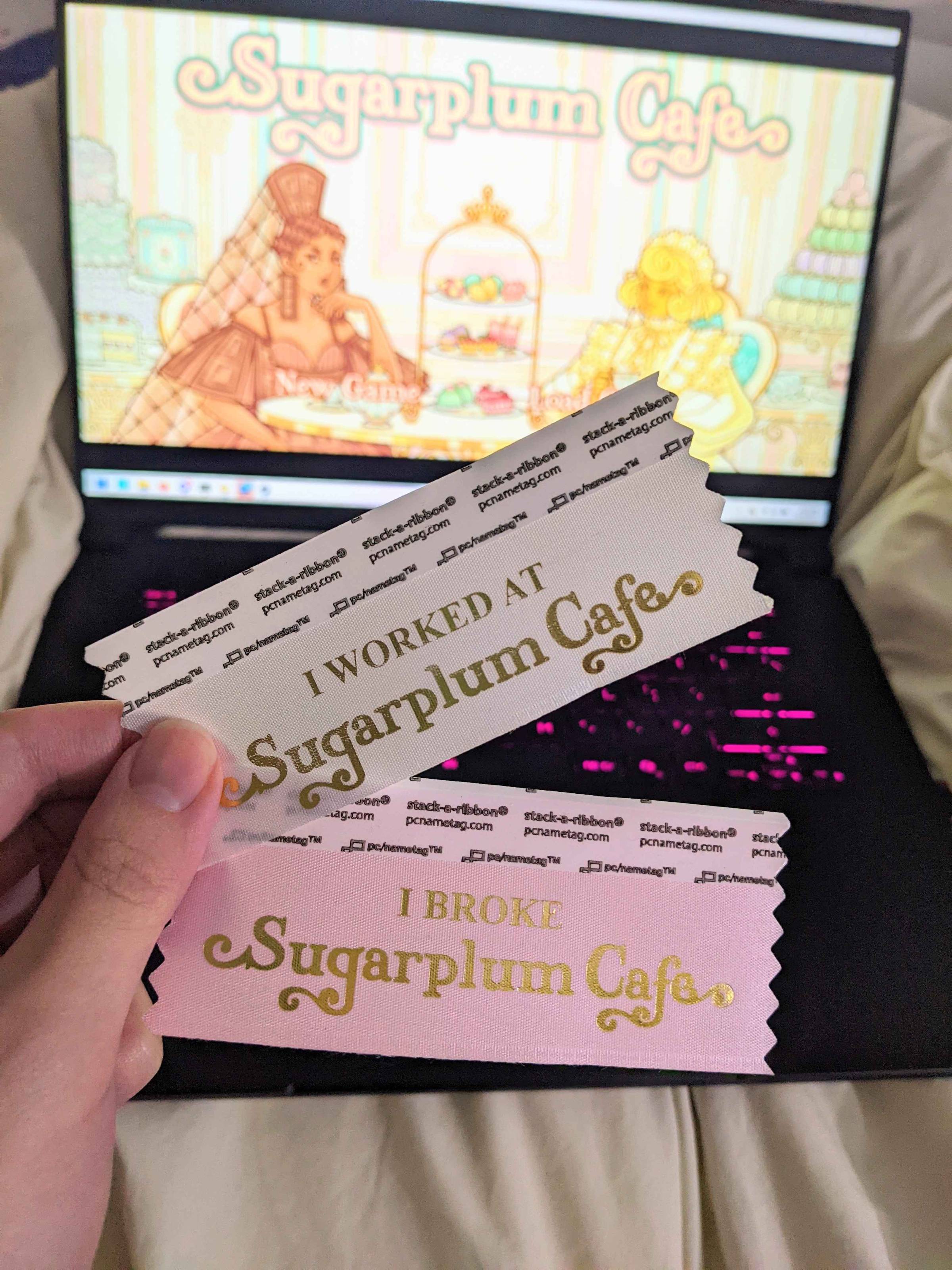 White ribbon says "I worked at Sugarplum Cafe", pink ribbon says "I broke Sugarplum Cafe"