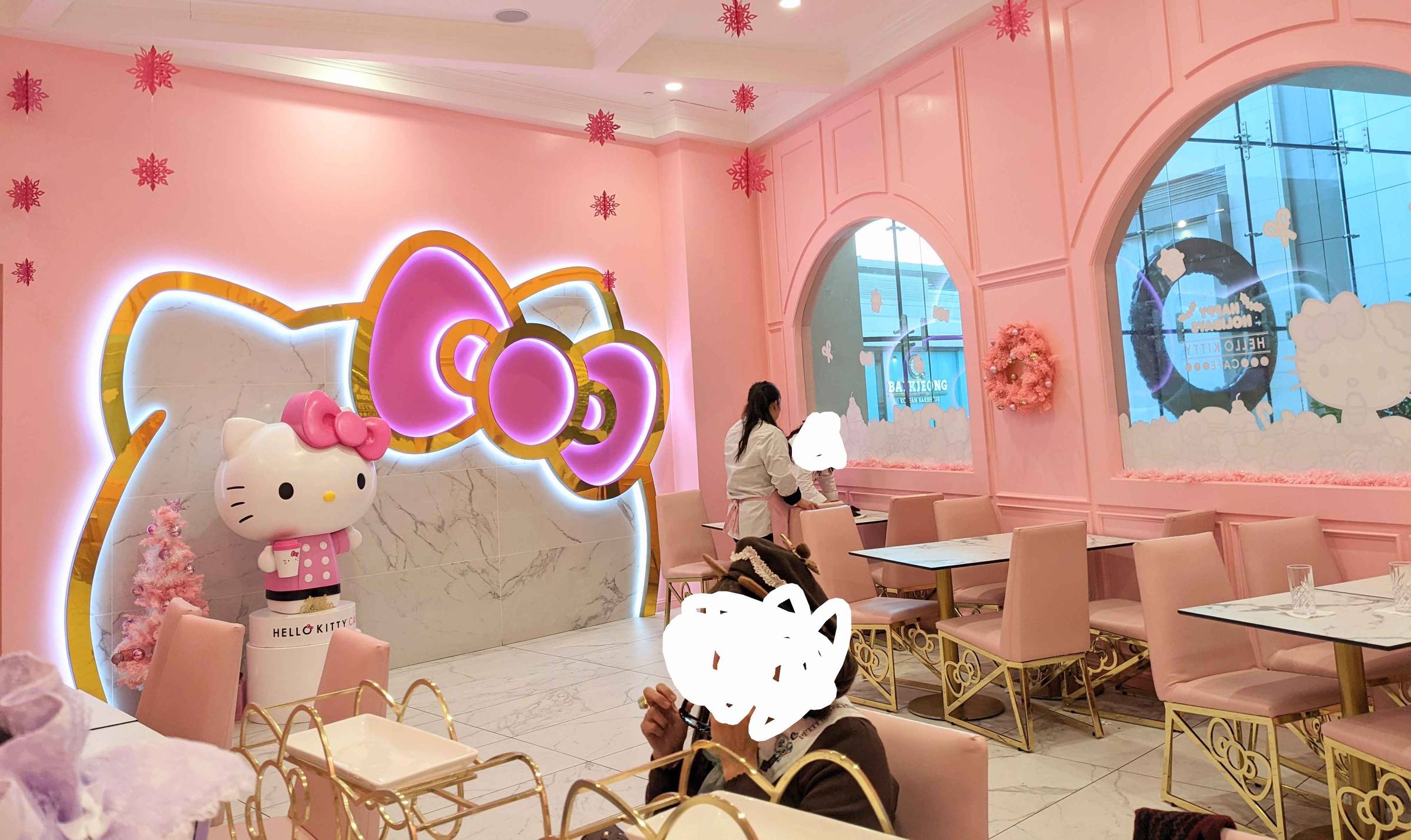 You can order at the Cafe to go anytime, but the Bow Room is only available with a reservation and is cutely decorated with pastel pink, white marble, and gold accents. Clock the Hello Kitty bows on the chairs!