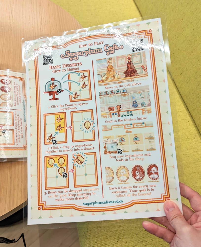 I immediately fell in love with the idea - not only would it give people waiting in line something to do, but priming them in advance means they could start further ahead in the game. So I made a guide loosely inspired by the layout of cafe menus. I even got it laminated, just like a real menu you'd get at a restaurant or cafe!