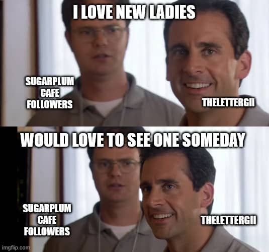 Meme of Michael and Dwight from The Office, with Michael saying "I love new Ladies. Would love to see one someday". Michael is labeled "thelettergii" and Dwight, looking baffled, is labeled "Sugarplum Cafe followers".